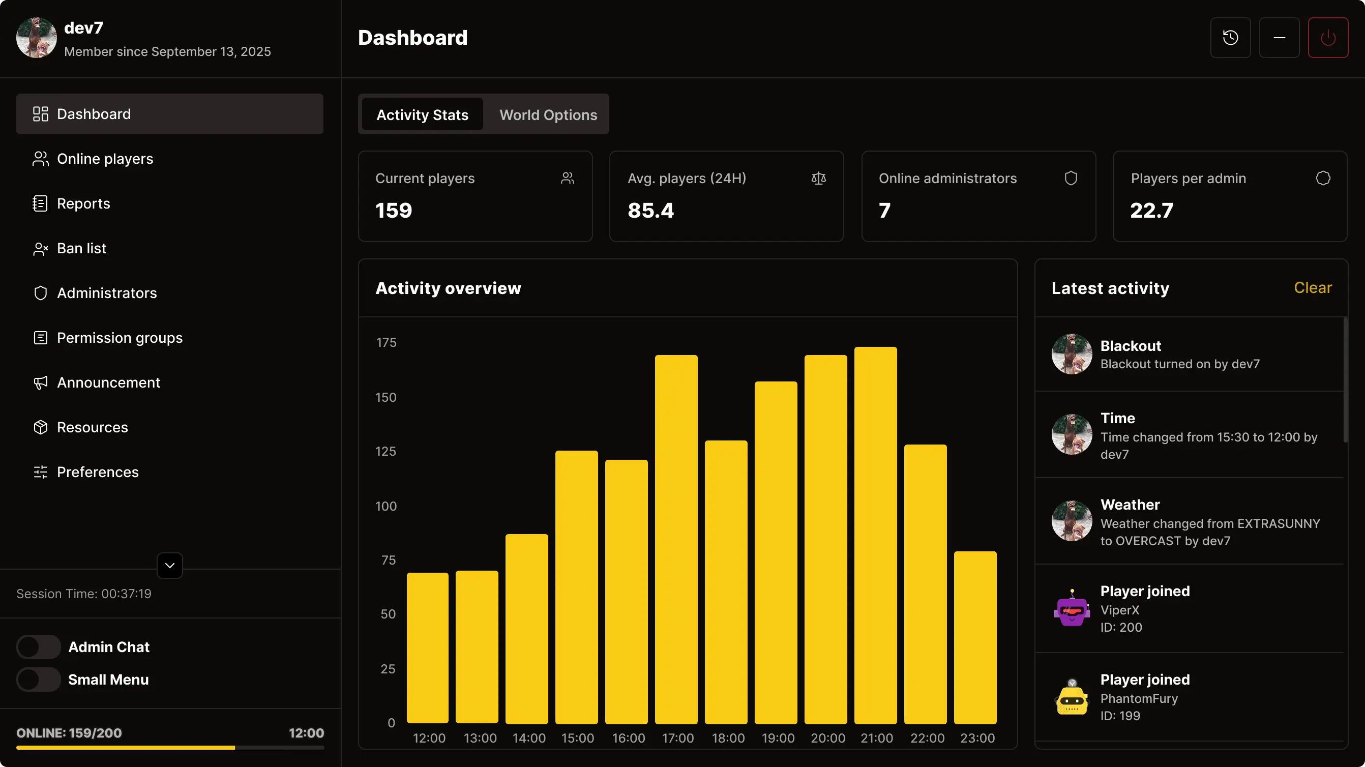 Track your admin team's activity with detailed statistics: playtime, spectated players, handled reports, bans, and more. Manage permissions per admin and stay in full control of your staff.